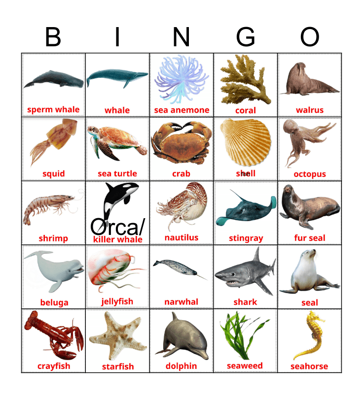 This bingo card has 28 images, a free space and 3 words: Orca/, fish and FREE!.