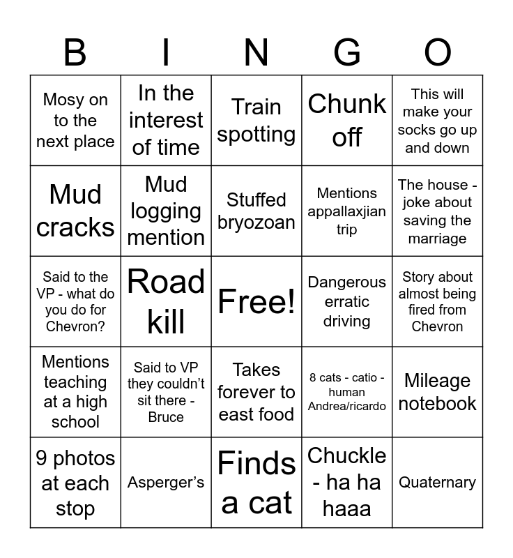 This bingo card has a free space and 34 words: Has trouble staying on road/swerves while driving, Chuckle - ha ha haaa, Heard of turtles, Animal demonstration- enactment, Mentions teaching at a high school, Mud logging mention, This will make your socks go up and down, 9 photos at each stop, In the interest of time, Let’s mosy along, Stuffed bryozoan, Train spotting, Rock people Appalachian story, Reference any past trip, Dangerous erratic driving, The house - joke about saving the marriage, Asperger’s, Said to the VP - what do you do for Chevron?, Said to VP they couldn’t sit there - Bruce, 8 cats - catio - human Andrea/ricardo, Takes forever to east food, Smile like you are having fun, Mosy on to the next place, Story about almost being fired from Chevron, Finds a cat, Quaternary, Chunk off, Cliff thanks people, Mentions appallaxjian trip, Mud cracks, Quick stop, Road kill, Mileage notebook and “Pretty cool, huh?”.