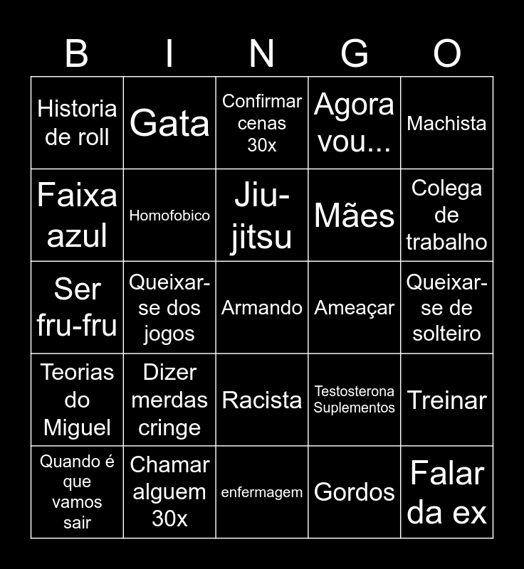 This bingo card has 25 words: Dizer merdas cringe, enfermagem, Jiu-jitsu, Quando é que vamos sair, Machista, Historia de roll, Faixa azul, Gata, Ameaçar, Racista, Mães, Ser fru-fru, Testosterona Suplementos, Treinar, Homofobico, Falar da ex, Queixar-se de solteiro, Confirmar cenas 30x, Colega de trabalho, Queixar-se dos jogos, Armando, Chamar alguem 30x, Teorias do Miguel, Agora vou... and Gordos.