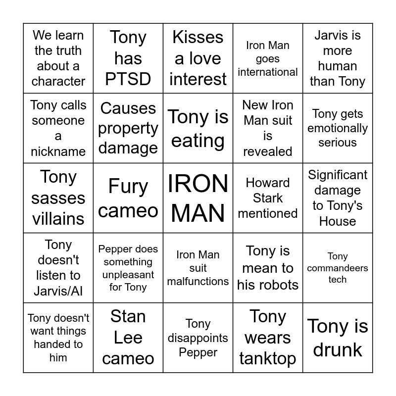 This bingo card has a free space and 30 words: Stan Lee cameo, Tony is shirtless or bare-chested, Fury cameo, Non-featured hero is referenced, We learn the truth about a character, Kisses a love interest, Causes property damage, Iron Man suit malfunctions, Howard Stark mentioned, Tony disappoints Pepper, Significant damage to Tony's House, Tony is drunk, Tony wears tanktop, Pepper is barefoot, Tony gets emotionally serious, Happy doesn't understand technology, Tony is mean to his robots, Tony doesn't listen to Jarvis/AI, Pepper does something unpleasant for Tony, Jarvis is more human than Tony, Tony sasses villains, Tony brags about himself, Tony has PTSD, New Iron Man suit is revealed, Tony calls someone a nickname, Iron Man goes international, Tony commandeers tech, Tony doesn't want things handed to him, Tony is eating and Tony is flirting.