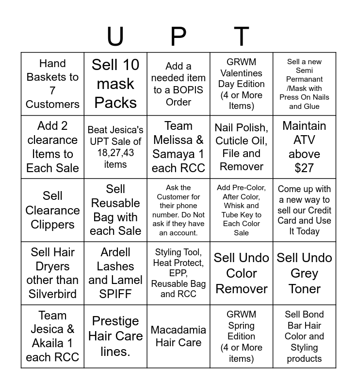 This bingo card has a free space and 24 words: Ardell Lashes and Lamel SPIFF, Prestige Hair Care lines., Team Melissa & Samaya 1 each RCC, Team Jesica & Akaila 1 each RCC, Sell a new Semi Permanant /Mask with Press On Nails and Glue, Hand Baskets to 7 Customers, Add 2 clearance Items to Each Sale, Sell 10 mask Packs, Add Pre-Color, After Color, Whisk and Tube Key to Each Color Sale, Styling Tool, Heat Protect, EPP, Reusable Bag and RCC, Nail Polish, Cuticle Oil, File and Remover, Sell Clearance Clippers, Sell Undo Color Remover, Sell Undo Grey Toner, Beat Jesica's UPT Sale of 18,27,43 items, GRWM Spring Edition (4 or More items), Come up with a new way to sell our Credit Card and Use It Today, Add a needed item to a BOPIS Order, Maintain ATV above $27, Sell Reusable Bag with each Sale, Sell Bond Bar Hair Color and Styling products, Sell Hair Dryers other than Silverbird, GRWM Valentines Day Edition (4 or More Items) and Macadamia Hair Care.