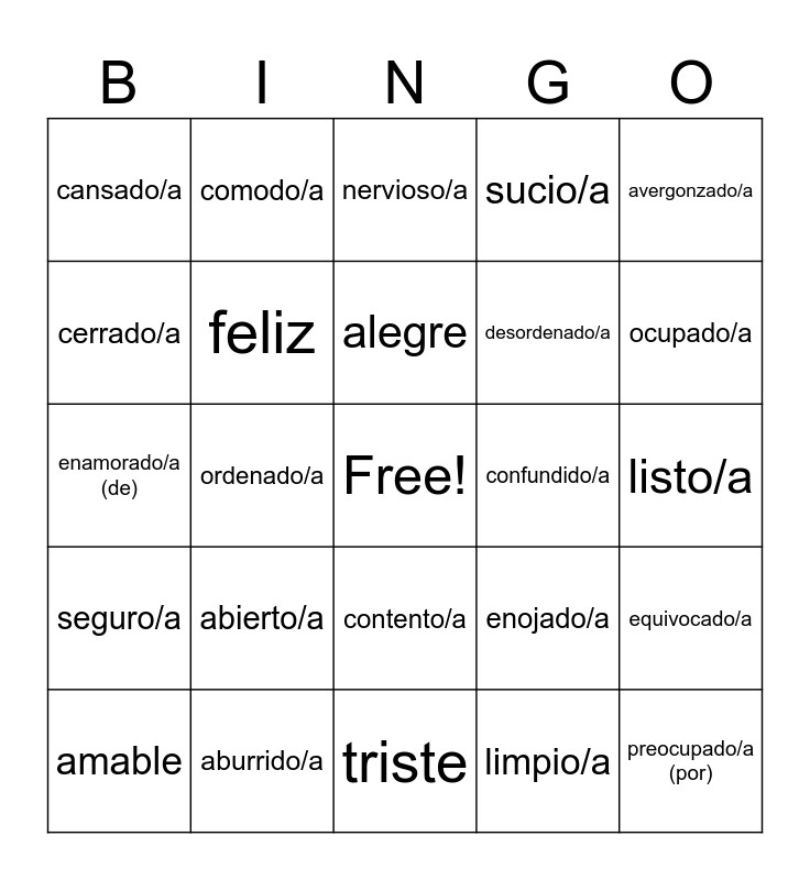 This bingo card has a free space and 24 words: abierto/a, aburrido/a, alegre, amable, avergonzado/a, cansado/a, cerrado/a, comodo/a, confundido/a, contento/a, desordenado/a, enamorado/a (de), enojado/a, equivocado/a, feliz, limpio/a, listo/a, nervioso/a, ocupado/a, ordenado/a, preocupado/a (por), seguro/a, sucio/a and triste.