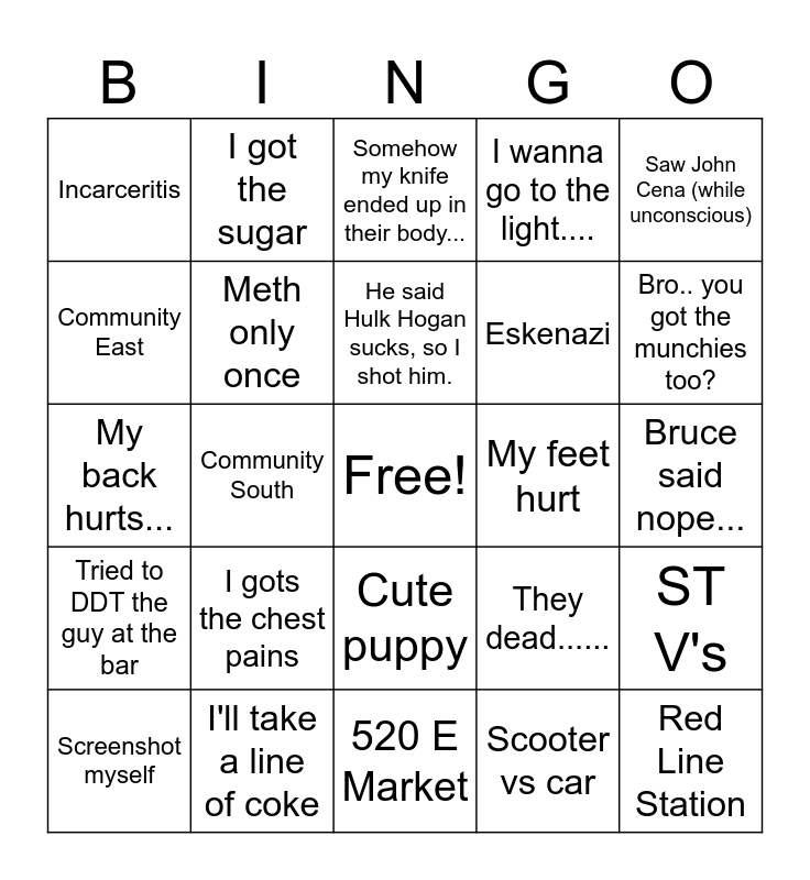 This bingo card has a free space and 34 words: Scooter vs curb, Scooter vs car, Too School For Cool (ETOH), Cardiac Arrest, Tried to DDT the guy at the bar, Meth only once, Saw John Cena (while unconscious), Screenshot myself, I got the sugar, Why is my finger over there?, He said Hulk Hogan sucks, so I shot him., Somehow my knife ended up in their body..., I can fly from the ropes... nope..., I'm cold..., My feet hurt, Bro.. you got the munchies too?, I'll take a line of coke, My back hurts..., I gots the chest pains, They dead......, Cute puppy, How much narcan?!, Incarceritis, Bruce said nope..., 520 E Market, Red Line Station, I wanna go to the light...., Methodist, Eskenazi, Community East, St Francis, Community South, ST V's and STEMI.
