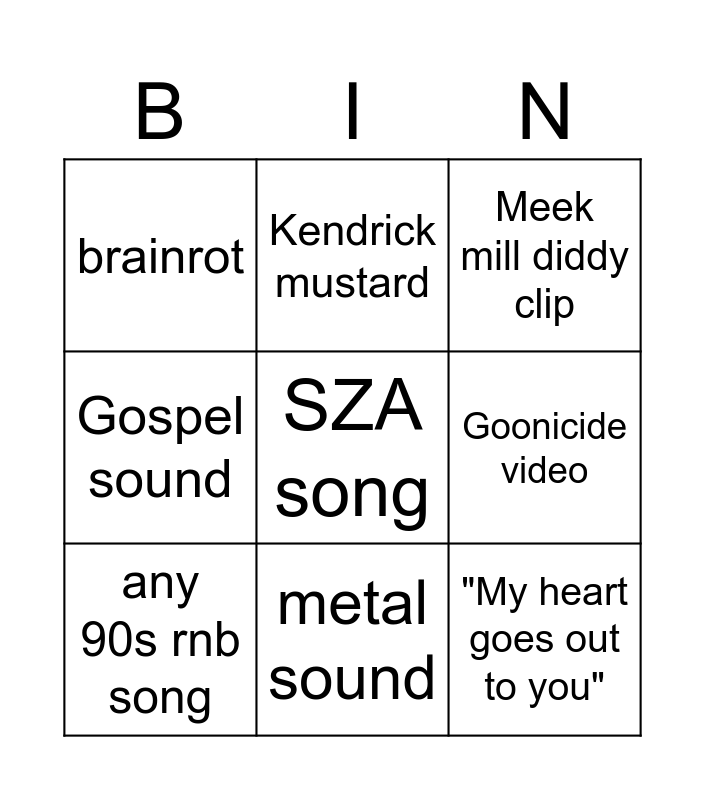 This bingo card has a free space and 8 words: Goonicide video, Meek mill diddy clip, Kendrick mustard, any 90s rnb song, brainrot, "My heart goes out to you", Gospel sound and metal sound.