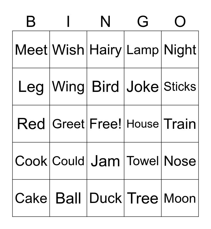 This bingo card has a free space and 24 words: Could, Ball, Bird, Cake, Night, Meet, Leg, Wish, House, Jam, Joke, Red, Towel, Nose, Wing, Tree, Train, Hairy, Sticks, Greet, Moon, Cook, Lamp and Duck.