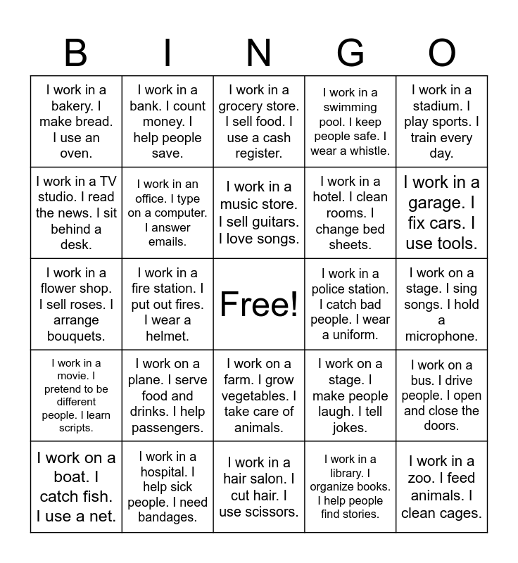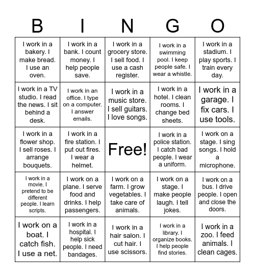 This bingo card has a free space and 30 words: I work in a hospital. I help sick people. I need bandages., I work in a school. I teach students. I use a chalkboard., I work in a fire station. I put out fires. I wear a helmet., I work in a restaurant. I cook food. I use a frying pan., I work in a bakery. I make bread. I use an oven., I work in a grocery store. I sell food. I use a cash register., I work in an office. I type on a computer. I answer emails., I work on a farm. I grow vegetables. I take care of animals., I work in a police station. I catch bad people. I wear a uniform., I work in a hair salon. I cut hair. I use scissors., I work on a stage. I sing songs. I hold a microphone., I work in a zoo. I feed animals. I clean cages., I work in a library. I organize books. I help people find stories., I work in a post office. I deliver letters. I wear a bag., I work in a garage. I fix cars. I use tools., I work in a factory. I make things. I use machines., I work on a stage. I make people laugh. I tell jokes., I work in a movie. I pretend to be different people. I learn scripts., I work on a plane. I serve food and drinks. I help passengers., I work in a stadium. I play sports. I train every day., I work in a flower shop. I sell roses. I arrange bouquets., I work in a clothing store. I fold shirts. I help customers., I work in a bank. I count money. I help people save., I work in a hotel. I clean rooms. I change bed sheets., I work in a TV studio. I read the news. I sit behind a desk., I work in a swimming pool. I keep people safe. I wear a whistle., I work on a bus. I drive people. I open and close the doors., I work on a boat. I catch fish. I use a net., I work in a music store. I sell guitars. I love songs. and I work in a zoo. I take pictures of animals. I use a camera..