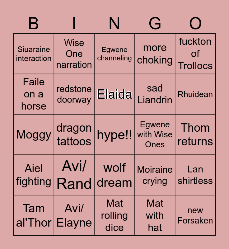 This bingo card has a free space and 24 words: Avi/ Rand, Avi/ Elayne, Elaida, Tam al'Thor, fuckton of Trollocs, Siuaraine interaction, Faile on a horse, Wise One narration, Egwene with Wise Ones, wolf dream, sad Liandrin, Moggy, Moiraine crying, Lan shirtless, redstone doorway, Mat with hat, Thom returns, Egwene channeling, Rhuidean, dragon tattoos, new Forsaken, Aiel fighting, more choking and Mat rolling dice.