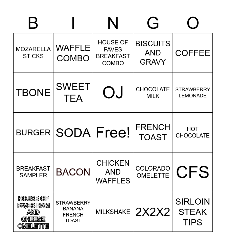 This bingo card has a free space and 24 words: HOUSE OF FAVES HAM AND CHEESE OMELETTE, BACON, OJ, 2X2X2, COFFEE, MOZARELLA STICKS, WAFFLE COMBO, HOUSE OF FAVES BREAKFAST COMBO, FRENCH TOAST, HOT CHOCOLATE, BURGER, SWEET TEA, COLORADO OMELETTE, CFS, TBONE, STRAWBERRY BANANA FRENCH TOAST, MILKSHAKE, BISCUITS AND GRAVY, STRAWBERRY LEMONADE, BREAKFAST SAMPLER, SODA, CHICKEN AND WAFFLES, CHOCOLATE MILK and SIRLOIN STEAK TIPS.