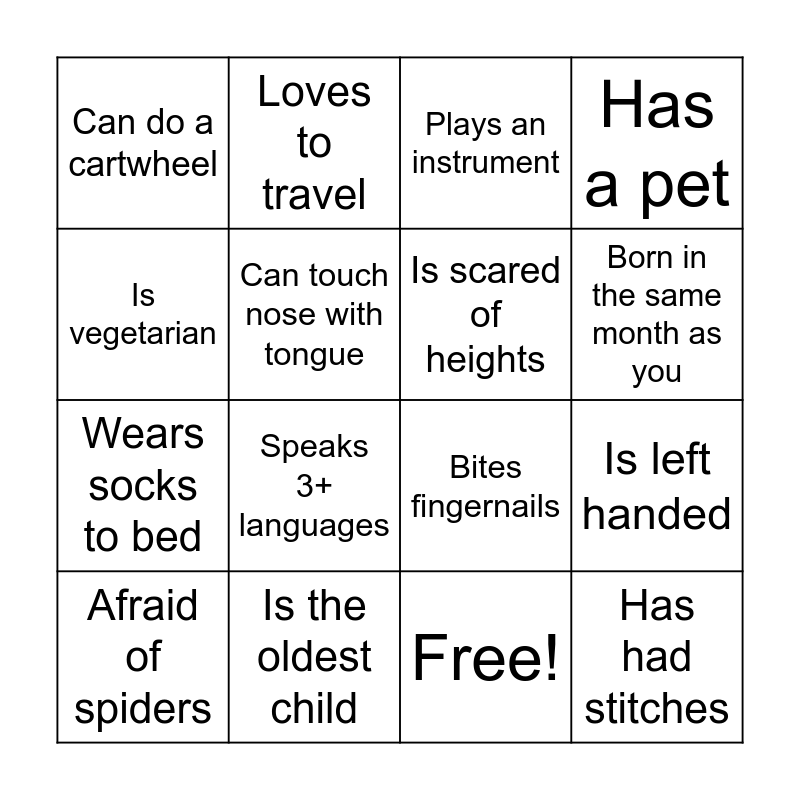 This bingo card has 17 words: Free!, Afraid of spiders, Plays an instrument, Can do a cartwheel, Speaks 3+ languages, Has a pet, Is left handed, Is scared of heights, Born in the same month as you, Can touch nose with tongue, Is the oldest child, Bites fingernails, Is vegetarian, Loves to travel, Wears socks to bed, Is an only child and Has had stitches.