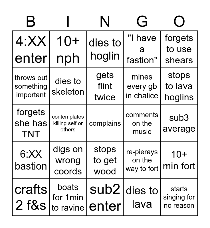 This bingo card has a free space and 24 words: digs on wrong coords, boats for 1min to ravine, gets flint twice, crafts 2 f&s, forgets to use shears, 4:XX enter, throws out something important, 10+ nph, comments on the music, stops to get wood, mines every gb in chalice, forgets she has TNT, re-pierays on the way to fort, 10+ min fort, dies to skeleton, dies to lava, sub3 average, dies to hoglin, stops to lava hoglins, contemplates killing self or others, starts singing for no reason, 6:XX bastion, "I have a fastion" and sub2 enter.