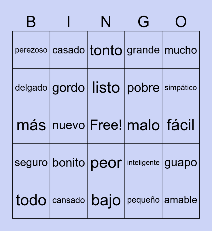 This bingo card has a free space and 51 words: alto, amable, antipático, bajo, bonito, bueno, casado, corto, delgado, feo, gordo, grande, guapo, inteligente, joven, largo, listo, malo, moreno, mucho, nuevo, pequeño, perezoso, pobre, rico, rubio, simpático, soltero, todo, tonto, trabajador, viejo, abierto, aburrido, alegre, cansado, cerrado, contento, mejor, difícil, fácil, seguro, limpio, ordenado, sucio, triste, más, mayor, menor, peor and preocupado.
