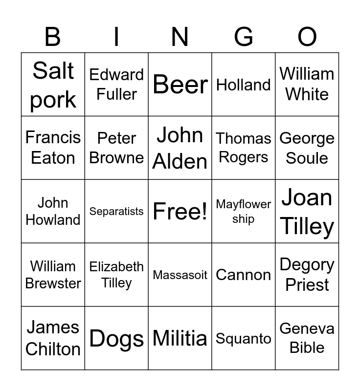 This bingo card has a free space and 24 words: Elizabeth Tilley, Dogs, John Alden, James Chilton, William White, Salt pork, Francis Eaton, Edward Fuller, Mayflower ship, Massasoit, Thomas Rogers, John Howland, Cannon, Degory Priest, Peter Browne, Squanto, Joan Tilley, Beer, George Soule, Separatists, Geneva Bible, William Brewster, Holland and Militia.