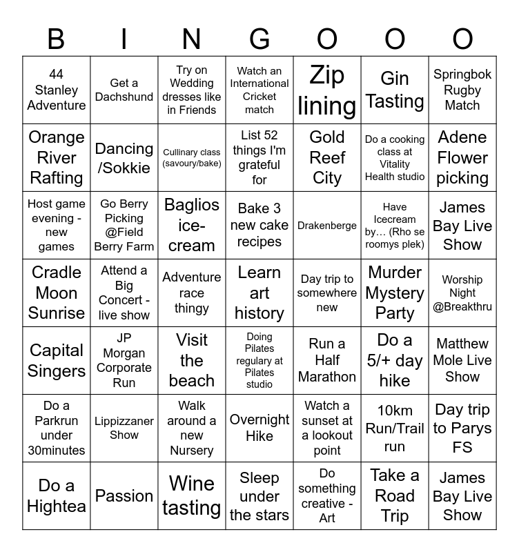 This bingo card has 72 words: Trip to Cape Town, Get a Dachshund, Gold Reef City, Matthew Mole Live Show, Bible Study, Stint @Alliance Francais (or self-study), Watch an International Cricket match, Wine tasting, Dancing /Sokkie, Harties Road trip, James Bay Live Show, James Bay Live Show, Cullinary class (savoury/bake), 44 Stanley Adventure, Skad Freefall @Soweto Towers, List 52 things I'm grateful for, Drakenberge, Zip lining, Do something creative - Art, Host game evening - new games, Baglios ice-cream, Do a cooking class at Vitality Health studio, Have Icecream by… (Rho se roomys plek), Worship Night @Breakthru, Visit the beach, 10km Run/Trail run, Walk around a new Nursery, Watch a sunset at a lookout point, Doing Pilates regulary at Pilates studio, Passion, Cradle Moon Sunrise, Take a Road Trip, Beer/Wine/Gin Run, Attend French Film @44 Stanley, Adventure race thingy, Do a 5/+ day hike, Do a 50th Parkrun, Friends Dinner, Gin Tasting, JP Morgan Corporate Run, Bake 3 new cake recipes, Learn art history, Do a Hightea, My Fairlady, Friends Breakfast, Go Berry Picking @Field Berry Farm, Capital Singers, Day trip to Parys FS, Get a Library card @Linden and use it, Run a Half Marathon, Do a Parkrun under 30minutes, Delta in the Park, Lippizzaner Show, Adene Flower picking, Day trip to somewhere new, Dance Classes, Try on Wedding dresses like in Friends, Orange River Rafting, Clay Café, Candlelight Concert, Cruise, Monte Casino, Murder Mystery Party, Attend a Big Concert - live show, Visit the Planetarium, Overnight Hike, Springbok Rugby Match, Sleep under the stars, Magnoliadal market, Pretoria Boeremark, Do a girly brunch by EL&N and Paint & Sip (or something creative).