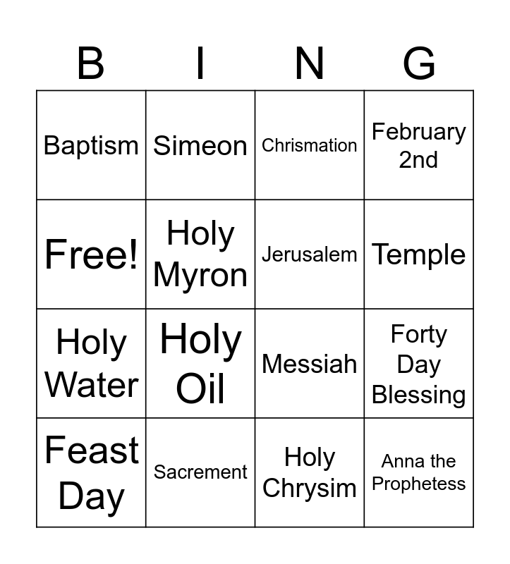 This bingo card has 16 words: Sacrement, Forty Day Blessing, Chrismation, Baptism, Holy Water, Simeon, Messiah, Holy Chrysim, Free!, Holy Myron, Feast Day, February 2nd, Holy Oil, Temple, Jerusalem and Anna the Prophetess.