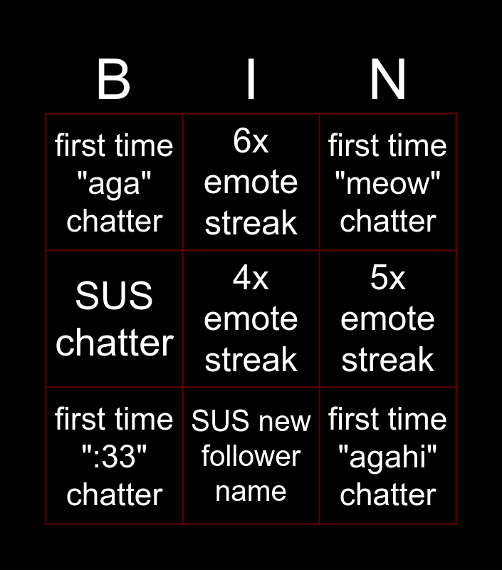 This bingo card has a free space and 8 words: 5x emote streak, first time "meow" chatter, 6x emote streak, first time ":33" chatter, first time "aga" chatter, first time "agahi" chatter, SUS chatter and SUS new follower name.