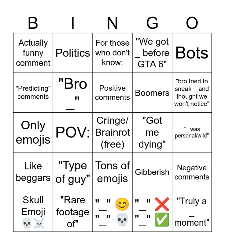 This bingo card has a free space and 29 words: Skull Emoji 💀☠️, Edit:, POV:, Comment that literally explains the situation in the video, Actually funny comment, For those who don't know:, "Bro _", "Type of guy", "Got me dying", "Rare footage of", "_ was personal/wild", "Truly a _ moment", "_" 😊 "_" 💀, "_" ❌ "_" ✅, "bro tried to sneak _ and thought we won't notice", "We are _ with this one 🗣️", Tons of emojis, Like beggars, Bots, Only emojis, Gibberish, Foreign language (Not English), Boomers, "Predicting" comments, "We got _ before GTA 6", Politics, Negative comments, Positive comments and "Anyone notice the _?".