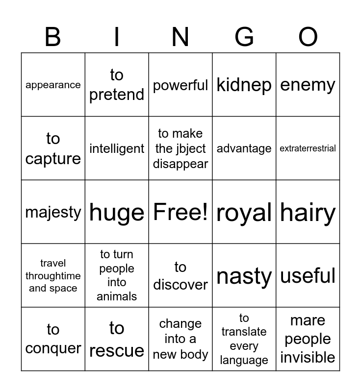 This bingo card has a free space and 24 words: to turn people into animals, to rescue, to make the jbject disappear, to conquer, enemy, appearance, to capture, to pretend, royal, to discover, advantage, majesty, nasty, useful, intelligent, to translate every language, hairy, powerful, extraterrestrial, huge, mare people invisible, travel throughtime and space, kidnep and change into a new body.
