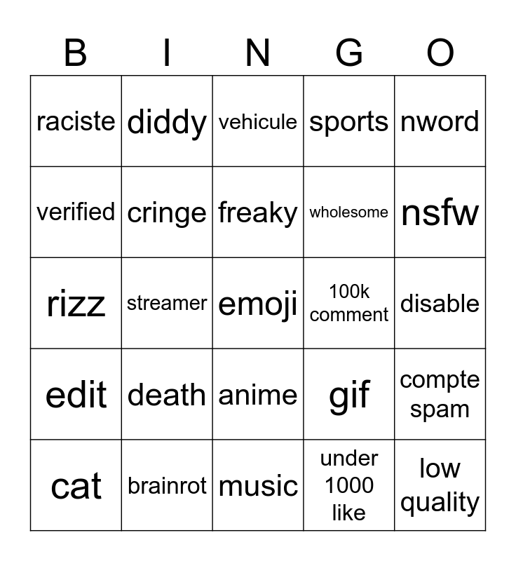 This bingo card has a free space and 24 words: death, brainrot, freaky, cat, nword, raciste, verified, diddy, 100k comment, anime, wholesome, rizz, gif, compte spam, cringe, under 1000 like, disable, vehicule, nsfw, streamer, low quality, edit, sports and music.