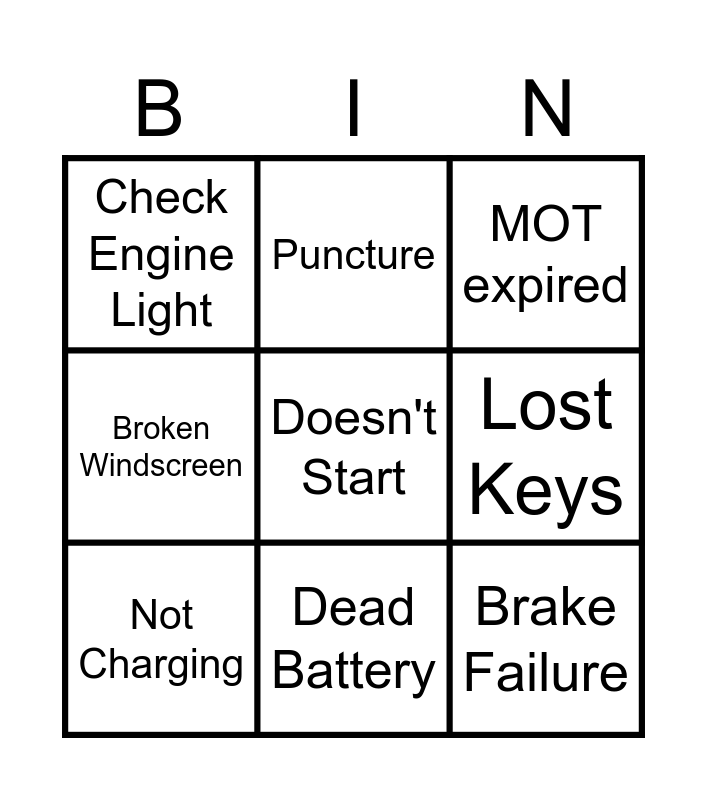 This bingo card has a free space and 8 words: Lost Keys, MOT expired, Puncture, Not Charging, Check Engine Light, Brake Failure, Broken Windscreen and Dead Battery.