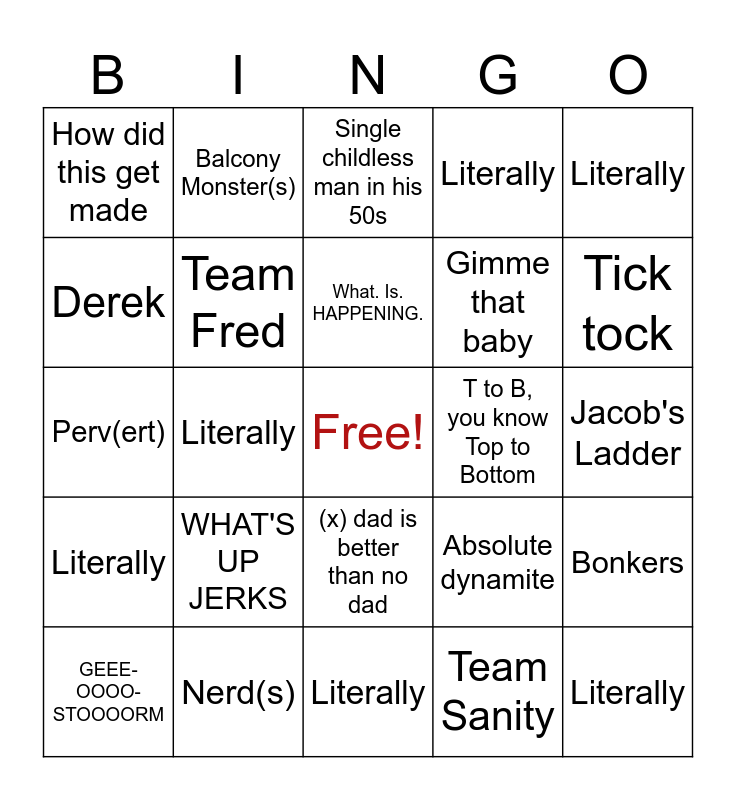 This bingo card has a free space and 24 words: WHAT'S UP JERKS, Nerd(s), What. Is. HAPPENING., GEEE-OOOO-STOOOORM, Literally, How did this get made, Derek, Balcony Monster(s), T to B, you know Top to Bottom, (x) dad is better than no dad, Gimme that baby, Perv(ert), Absolute dynamite, Bonkers, Team Fred, Team Sanity, Jacob's Ladder, Single childless man in his 50s, Tick tock, Literally, Literally, Literally, Literally and Literally.