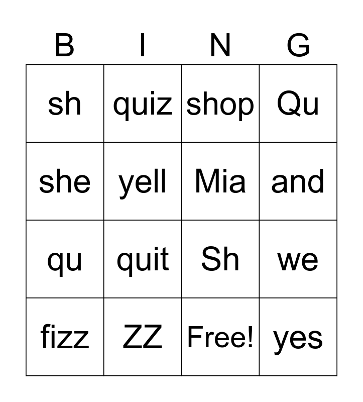 This bingo card has 17 words: Free!, fizz, shop, sh, quit, Qu, we, Mia, and, yell, ZZ, Sh, she, quiz, qu, buzz and yes.
