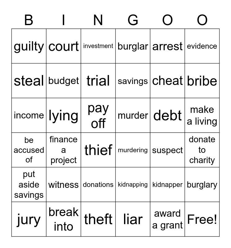 This bingo card has 42 words: award a grant, budget, debit an account, debt, donate to charity, finance a project, income, interest rate, investment, make a living, pay off, savings, bribe, arrest, break into, be accused of, burglary, cheat, Free!, court, evidence, donations, put aside savings, guilty, judge, jury, trial, verdict, witness, kidnapper, lie, murder, steal, suspect, theft, thief, murdering, lying, kidnapping, liar, burglar and bribery.