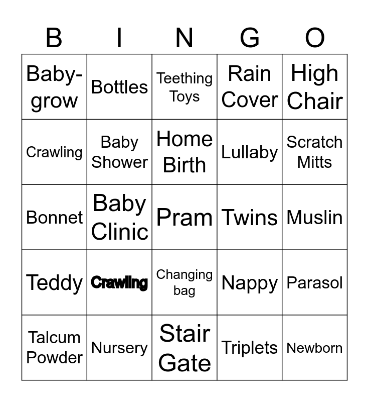 This bingo card has 25 words: Crawling, Stair Gate, Home Birth, Talcum Powder, High Chair, Baby-grow, Crawling, Bottles, Twins, Changing bag, Lullaby, Bonnet, Nappy, Parasol, Baby Shower, Newborn, Muslin, Teething Toys, Scratch Mitts, Baby Clinic, Pram, Nursery, Teddy, Rain Cover and Triplets.