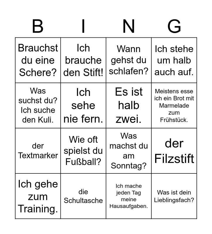 This bingo card has 16 words: die Schultasche, der Filzstift, Wann gehst du schlafen?, Brauchst du eine Schere?, der Textmarker, Ich brauche den Stift!, Was machst du am Sonntag?, Ich mache jeden Tag meine Hausaufgaben., Was suchst du? Ich suche den Kuli., Ich sehe nie fern., Ich gehe zum Training., Ich stehe um halb auch auf., Wie oft spielst du Fußball?, Meistens esse ich ein Brot mit Marmelade zum Frühstück., Es ist halb zwei. and Was ist dein Lieblingsfach?.