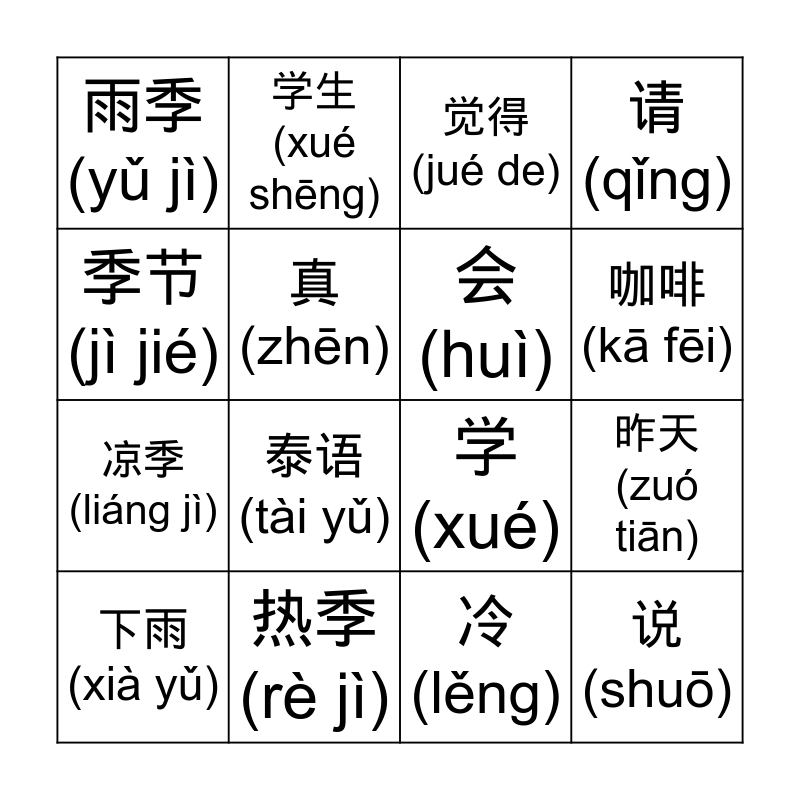 天气 Bingo | Weather in Chinese C3 | weather and season | Seasons G4 Pinyin | Season & Weather Bingo