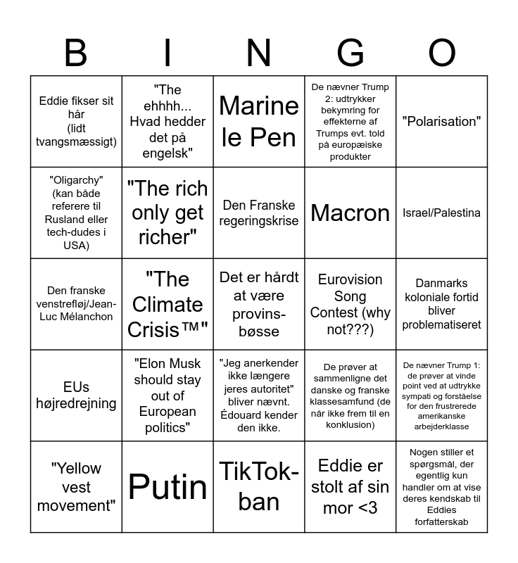 This bingo card has 25 words: "Elon Musk should stay out of European politics", TikTok-ban, Den Franske regeringskrise, "Yellow vest movement", "Polarisation", Eddie fikser sit hår (lidt tvangsmæssigt), "Oligarchy" (kan både referere til Rusland eller tech-dudes i USA), "The ehhhh... Hvad hedder det på engelsk", Eurovision Song Contest (why not???), "Jeg anerkender ikke længere jeres autoritet" bliver nævnt. Édouard kender den ikke., Macron, Den franske venstrefløj/Jean-Luc Mélanchon, De prøver at sammenligne det danske og franske klassesamfund (de når ikke frem til en konklusion), De nævner Trump 1: de prøver at vinde point ved at udtrykke sympati og forståelse for den frustrerede amerikanske arbejderklasse, "The rich only get richer", Nogen stiller et spørgsmål, der egentlig kun handler om at vise deres kendskab til Eddies forfatterskab, Danmarks koloniale fortid bliver problematiseret, Marine le Pen, Israel/Palestina, "The Climate Crisis™", Det er hårdt at være provins-bøsse, Putin, EUs højredrejning, De nævner Trump 2: udtrykker bekymring for effekterne af Trumps evt. told på europæiske produkter and Eddie er stolt af sin mor <3.