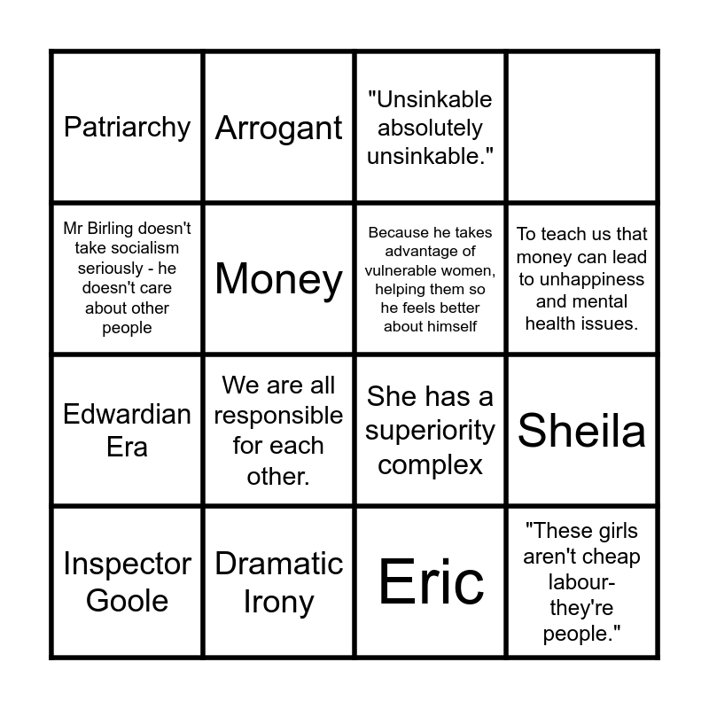 This bingo card has 16 words: Dramatic Irony, Sheila, "Unsinkable absolutely unsinkable.", Patriarchy, Edwardian Era, Arrogant, She has a superiority complex, Eric, Mr Birling doesn't take socialism seriously - he doesn't care about other people, Money, Inspector Goole, UUU, We are all responsible for each other., To teach us that money can lead to unhappiness and mental health issues., Because he takes advantage of vulnerable women, helping them so he feels better about himself and "These girls aren't cheap labour- they're people.".