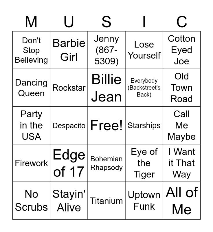 This bingo card has a free space and 68 words: A Thousand Miles, All of Me, Another One Bites the Dust, As Long As You Love Me, Bad Guy, Bad Romance, Barbie Girl, Beat It, Billie Jean, Blinding Lights, Bohemian Rhapsody, Bye Bye Bye, Call Me Maybe, Cotton Eyed Joe, Counting Stars, Dancing Queen, Despacito, Don't Stop Believing, Dynamite, Edge of 17, Everybody (Backstreet’s Back), Eye of the Tiger, Firework, Gangnam Style, Happy, Hey Ya!, Hit Me Baby One More Time, I Wanna Dance with Somebody, I Want it That Way, In the End, Jenny (867-5309), Jessie’s Girl, Just The Way You Are, Like a Prayer, Lose Yourself, Macarena, My Heart Will Go On, No Scrubs, Old Town Road, Party in the USA, Push It, Respect, Rockstar, September, Since You Been Gone, Single Ladies (Put a Ring on it), Someone Like You, Sorry, Starships, Stayin' Alive, Take On Me, Thriller, Tik Tok, Titanium, Total Eclipse of the Heart, U Can’t Touch This, Uptown Funk, Wannabe, We Didn't Start The Fire, We Will Rock You, What Makes You Beautiful, Wobble, Y.M.C.A., You Belong With Me, You Give Love a Bad Name, You Got It (The Right Stuff), Your Song and Ghost.