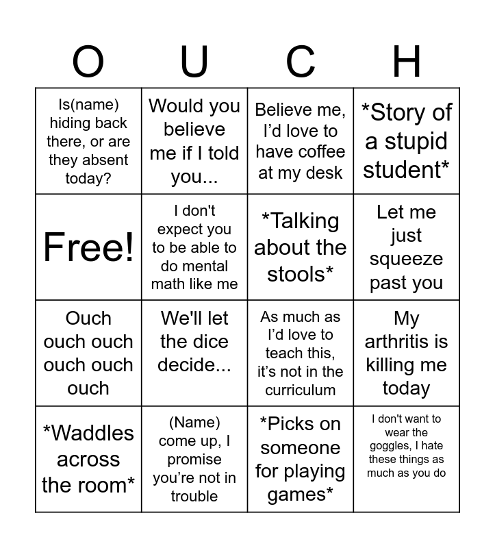 This bingo card has 16 words: (Name) come up, I promise you’re not in trouble, My arthritis is killing me today, Believe me, I’d love to have coffee at my desk, Is(name) hiding back there, or are they absent today?, Ouch ouch ouch ouch ouch ouch, Would you believe me if I told you..., As much as I’d love to teach this, it’s not in the curriculum, *Picks on someone for playing games*, Free!, I don't expect you to be able to do mental math like me, *Waddles across the room*, *Story of a stupid student*, We'll let the dice decide..., Let me just squeeze past you, *Talking about the stools* and I don't want to wear the goggles, I hate these things as much as you do.