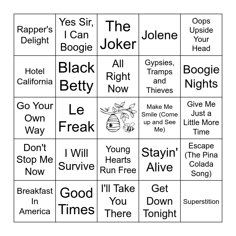 This bingo card has a free space and 32 words: Get Down Tonight, Don't Stop 'Til You Get Enough, Le Freak, Funkytown, Don't Stop Me Now, Black Betty, Oops Upside Your Head, Escape (The Pina Colada Song), Yes Sir, I Can Boogie, Mr. Blue Sky, All Right Now, The Joker, Lola, Layla, Make Me Smile (Come up and See Me), Cold As Ice, Breakfast In America, Go Your Own Way, Young Hearts Run Free, I Will Survive, Stayin' Alive, Boogie Wonderland, Give Me Just a Little More Time, Good Times, Superstition, Jolene, Gypsies, Tramps and Thieves, Hotel California, Rapper's Delight, I'll Take You There, Love Train and Boogie Nights.
