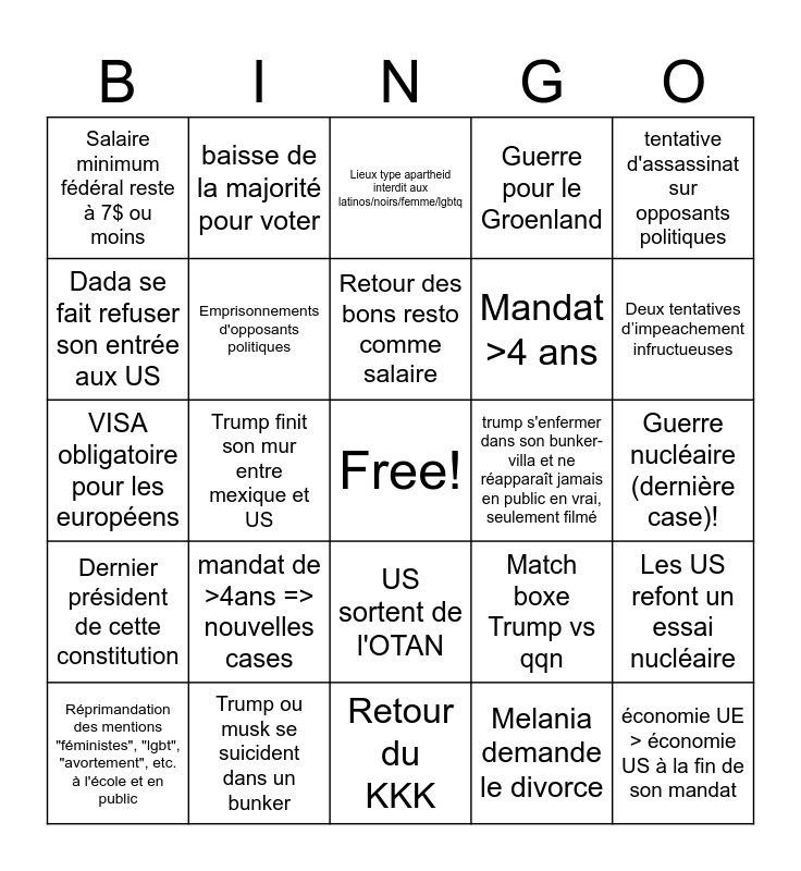 This bingo card has a free space and 33 words: Trump et Musk sont plus copains et se tapent sur la gueule, Musk lance un coup d’état, Trump finit son mur entre mexique et US, 1chf=2$, Dernier président de cette constitution, Emprisonnements d'opposants politiques, tentative d'assassinat sur opposants politiques, Réprimandation des mentions "féministes", "lgbt", "avortement", etc. à l'école et en public, baisse de la majorité pour voter, baisse de l'âge légal de fin d'école obligatoire, Retour des bons resto comme salaire, Lieux type apartheid interdit aux latinos/noirs/femme/lgbtq, Les us redeviennent un giga paradis fiscal, Une nouvelle golden shower de trump, trump s'enfermer dans son bunker-villa et ne réapparaît jamais en public en vrai, seulement filmé, Deux tentatives d’impeachement infructueuses, Trump ou musk se suicident dans un bunker, VISA obligatoire pour les européens, mandat de >4ans => nouvelles cases, Match boxe Trump vs qqn, US sortent de l'OTAN, Déportation annulée, ils acceptent des gens, Salaire minimum fédéral reste à 7$ ou moins, Guerre nucléaire (dernière case)!, Retour du KKK, économie UE > économie US à la fin de son mandat, Guerre pour le Groenland, Mandat >4 ans, Dada se fait refuser son entrée aux US, Les US refont un essai nucléaire, Trump meurt avant la fin de son mandat, Melania demande le divorce and Musk est candidat aux présidentielles dans 4 ans.