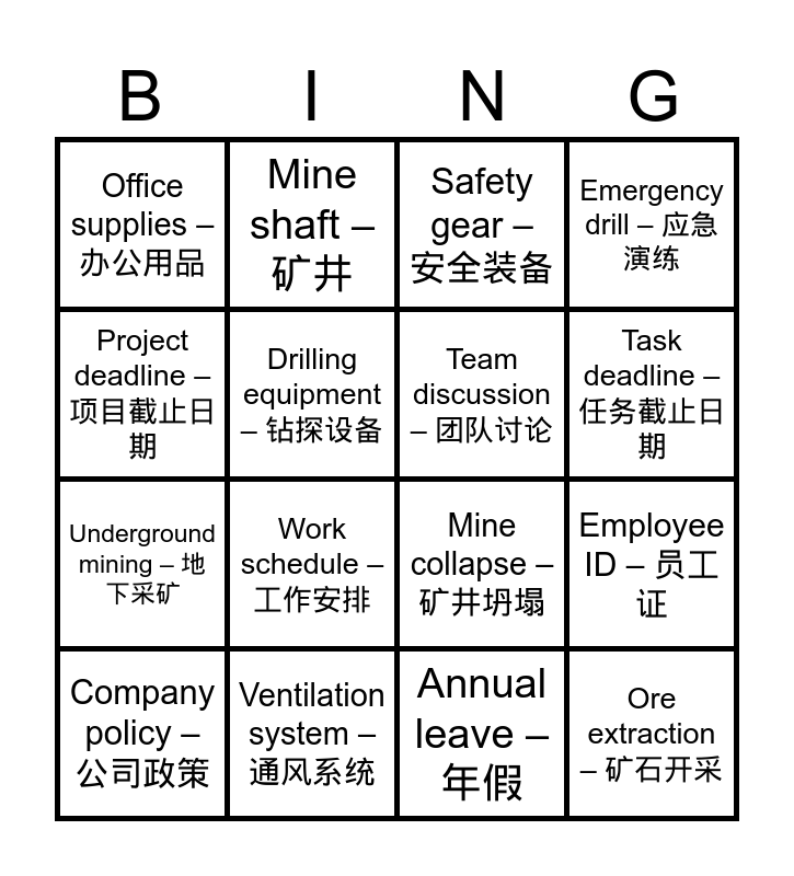 This bingo card has 28 words: Mine site – 矿场, Safety inspection – 安全检查, Underground mining – 地下采矿, Heavy machinery – 重型机械, Drilling equipment – 钻探设备, Safety gear – 安全装备, Mine shaft – 矿井, Ore extraction – 矿石开采, Ventilation system – 通风系统, Mineral resources – 矿产资源, Mine collapse – 矿井坍塌, Emergency drill – 应急演练, Safety regulations – 安全规定, Mining engineer – 采矿工程师, Work schedule – 工作安排, Office meeting – 办公室会议, Data report – 数据报告, Team discussion – 团队讨论, Task deadline – 任务截止日期, Business trip – 出差, Office supplies – 办公用品, Printer not working – 打印机坏了, Company policy – 公司政策, Employee ID – 员工证, Annual leave – 年假, Email notification – 电子邮件通知, Project deadline – 项目截止日期 and Performance review – 绩效考核.