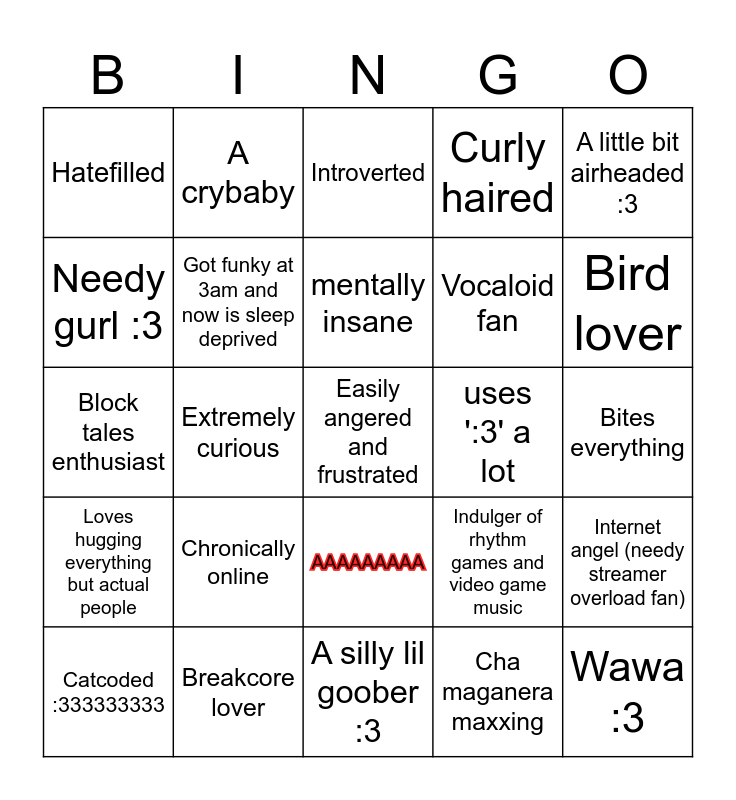 This bingo card has 25 words: Chronically online, A silly lil goober :3, mentally insane, Catcoded :333333333, A little bit airheaded :3, Hatefilled, Needy gurl :3, A crybaby, uses ':3' a lot, AAAAAAAAA, Vocaloid fan, Block tales enthusiast, Indulger of rhythm games and video game music, Internet angel (needy streamer overload fan), Got funky at 3am and now is sleep deprived, Wawa :3, Bites everything, Introverted, Bird lover, Extremely curious, Easily angered and frustrated, Breakcore lover, Loves hugging everything but actual people, Curly haired and Cha maganera maxxing.