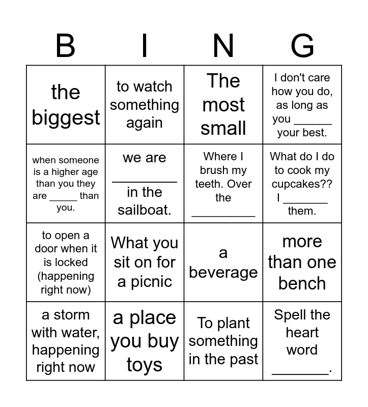 This bingo card has 16 words: a place you buy toys, more than one bench, The most small, the biggest, to open a door when it is locked (happening right now), to watch something again, a beverage, To plant something in the past, when someone is a higher age than you they are _____ than you., we are ________ in the sailboat., a storm with water, happening right now, I don't care how you do, as long as you ______ your best., What you sit on for a picnic, What do I do to cook my cupcakes?? I _______ them., Where I brush my teeth. Over the __________ and Spell the heart word _______..