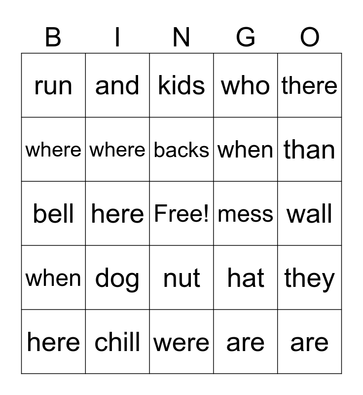 This bingo card has a free space and 34 words: were, are, who, what, when, where, there, here, and, you, backs, kids, lips, sheds, mess, than, chill, bell, dog, hat, nut, fox, run, wall, were, are, who, what, when, where, there, here, they and was.