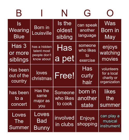 This bingo card has a free space and 24 words: Has the same major as you, Loves Bad Bunny, Has a pet, Loves The Summer, Was Born in May, Is Wearing Blue, Has 3 or more siblings, Born in Louisville, Has curly hair, Someone who likes to cook, someone who likes to exercise, Has been out of the country, born in another state, likes the summer, has a hidden talent most people don’t know about, Enjoys shopping, volunteers for a local charity or organization, Is the oldest sibling, enjoys watching movies, loves christmas, can play a musical instrument, has been to a concert, can speak another language and involved in clubs.