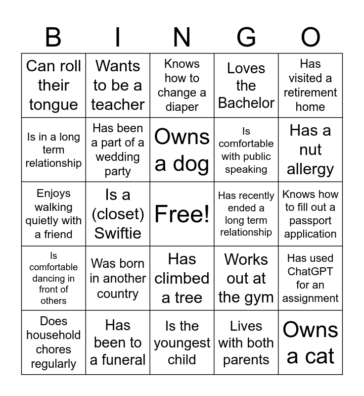 This bingo card has a free space and 34 words: Is the eldest child, Lives with both parents, Is an aunt or uncle, Knows how to surf, Is comfortable dancing in front of others, Has been a part of a wedding party, Has visited a retirement home, Does household chores regularly, Wants to be a teacher, Hates broccoli, Owns a dog, Knows how to change a diaper, Speaks another language, Plays a competitive sport, Has recently ended a long term relationship, Has a nut allergy, Has been to a funeral, Enjoys walking quietly with a friend, Was born in another country, Works out at the gym, Has climbed a tree, Has broken a bone, Can roll their tongue, Knows how to fill out a passport application, Is the youngest child, Owns a cat, Loves the Bachelor, Is the middle child, Is comfortable with public speaking, Is in a long term relationship, Is allergic to shellfish, Is a (closet) Swiftie, Has used ChatGPT for an assignment and Is lactose intolerant.