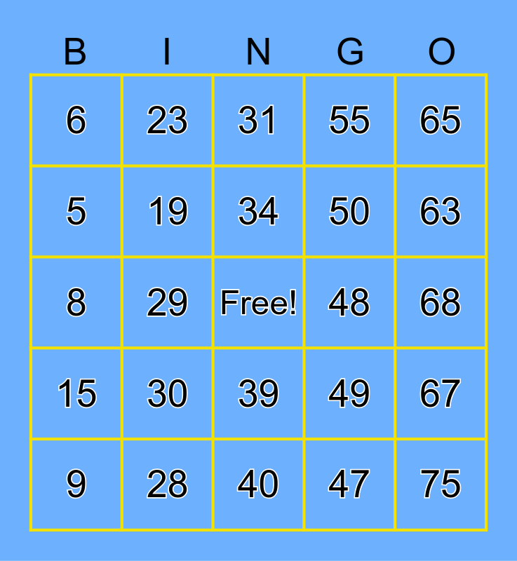 This bingo card has a free space and 75 words: 1, 16, 31, 46, 61, 2, 17, 32, 47, 62, 3, 18, 48, 63, 4, 19, 33, 49, 64, 5, 20, 34, 50, 65, 6, 21, 35, 51, 66, 7, 22, 36, 52, 67, 8, 23, 37, 53, 68, 9, 24, 38, 54, 69, 10, 25, 39, 55, 70, 11, 26, 40, 56, 71, 12, 27, 41, 57, 72, 13, 28, 42, 58, 73, 14, 29, 43, 59, 74, 15, 30, 44, 60, 75 and 45.