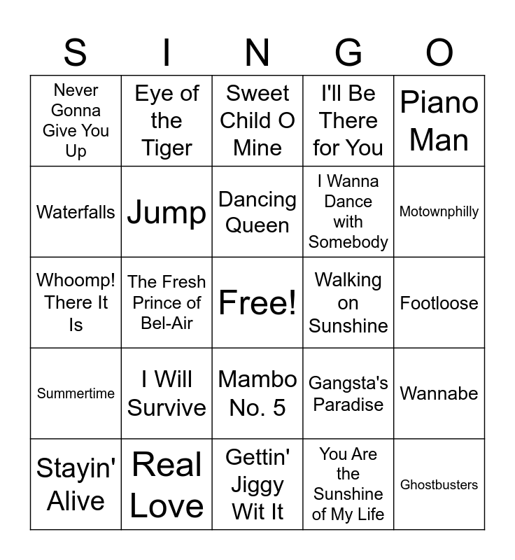 This bingo card has a free space and 24 words: Stayin' Alive, I Will Survive, Dancing Queen, You Are the Sunshine of My Life, Piano Man, Never Gonna Give You Up, Eye of the Tiger, Sweet Child O Mine, Walking on Sunshine, Footloose, Whoomp! There It Is, Jump, Gangsta's Paradise, Wannabe, Waterfalls, Real Love, Gettin' Jiggy Wit It, I'll Be There for You, Motownphilly, Summertime, The Fresh Prince of Bel-Air, Mambo No. 5, I Wanna Dance with Somebody and Ghostbusters.