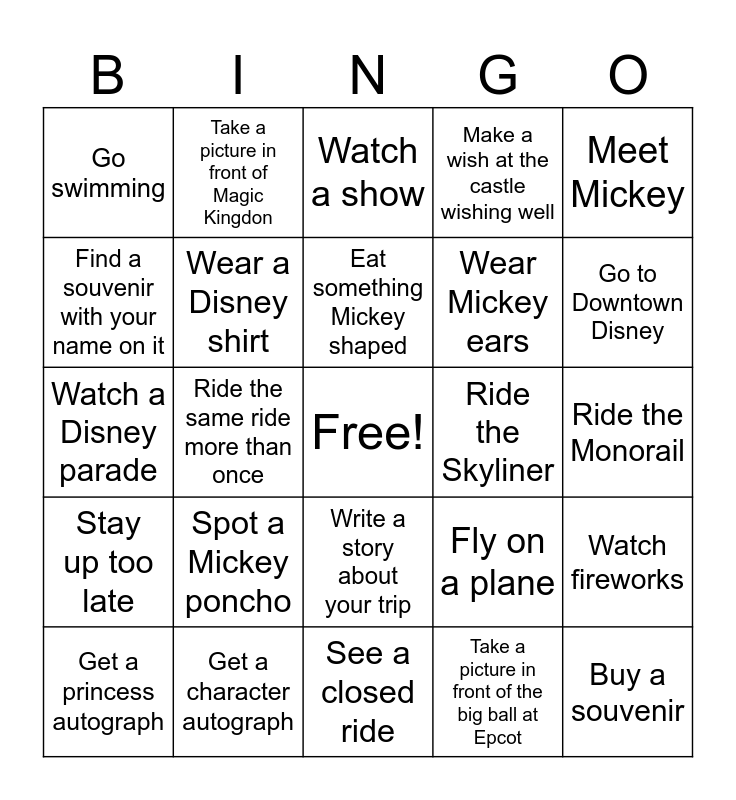 This bingo card has a free space and 25 words: Spot a Mickey poncho, See a closed ride, Eat something Mickey shaped, Get a princess autograph, Meet Mickey, Go swimming, Find a souvenir with your name on it, Take a picture in front of Magic Kingdon, Ride the Skyliner, Write a story about your trip, Wear Mickey ears, Watch a Disney parade, Fly on a plane, Watch fireworks, Wear a Disney shirt, Visit another country, Ride the Monorail, Watch a show, Go to Downtown Disney, Ride the same ride more than once, Buy a souvenir, Get a character autograph, Stay up too late, Make a wish at the castle wishing well and Take a picture in front of the big ball at Epcot.