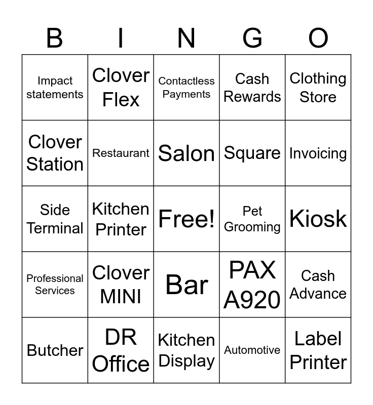 This bingo card has a free space and 24 words: Clover MINI, DR Office, Salon, Butcher, Clothing Store, Impact statements, Clover Station, Clover Flex, Pet Grooming, Bar, Square, Side Terminal, PAX A920, Cash Advance, Restaurant, Automotive, Kiosk, Contactless Payments, Invoicing, Kitchen Printer, Label Printer, Professional Services, Cash Rewards and Kitchen Display.