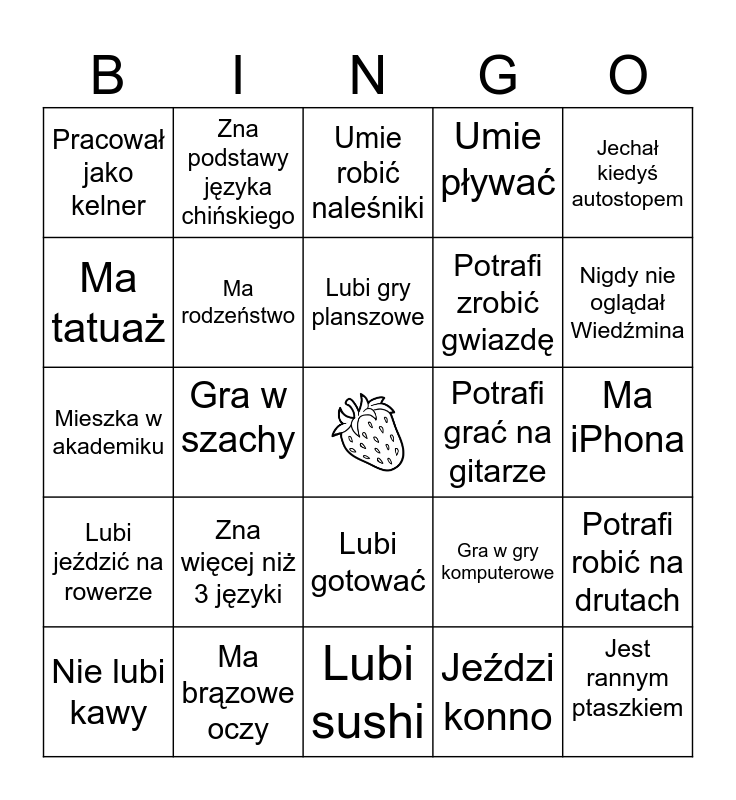 This bingo card has a free space and 39 words: Ma niebieskie oczy, Ma kota, Ma patent żeglarski, Ma rodzeństwo, Nie lubi kawy, Lubi gotować, Lubi gry planszowe, Jest harcerzem, Jechał kiedyś autostopem, Lubi jeździć na rowerze, Gra w szachy, Umie pływać, Jest rannym ptaszkiem, Ma iPhona, Potrafi grać na gitarze, Zna więcej niż 3 języki, Był na Erasmusie, Pracował jako kelner, Jest wegetarianinem, Gra w gry komputerowe, Ma tatuaż, Lubi sushi, Potrafi zrobić gwiazdę, Nigdy nie oglądał Wiedźmina, Umie jeździć na rolkach, Jest fanem Star Wars, Ma blond włosy, Nigdy nie leciał samolotem, Ma czarne włosy, Zna podstawy języka chińskiego, Jeździ na nartach, Ma konto na TikToku, Umie robić naleśniki, Ma brązowe oczy, Jeździ konno, Nigdy nie używał Duolingo, Potrafi robić na drutach, Mieszka w akademiku and Ma psa.