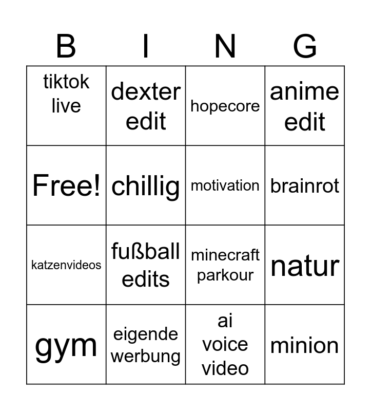 This bingo card has 16 words: eigende werbung, natur, hopecore, tiktok live, katzenvideos, dexter edit, minecraft parkour, ai voice video, Free!, chillig, gym, anime edit, fußball edits, brainrot, motivation and minion.