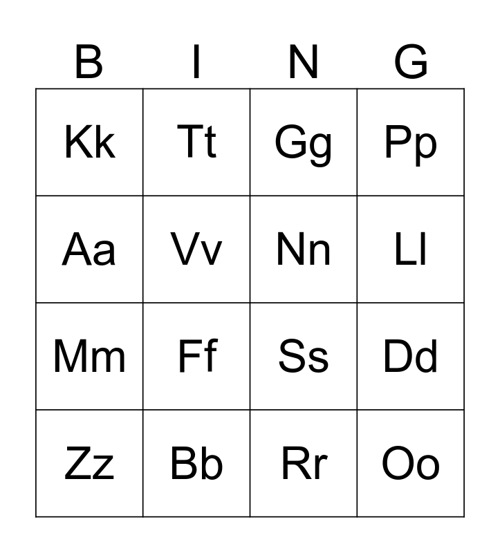 This bingo card has 16 words: Bb, Dd, Gg, Kk, Mm, Tt, Ss, Rr, Aa, Vv, Zz, Pp, Ff, Ll, Nn and Oo.