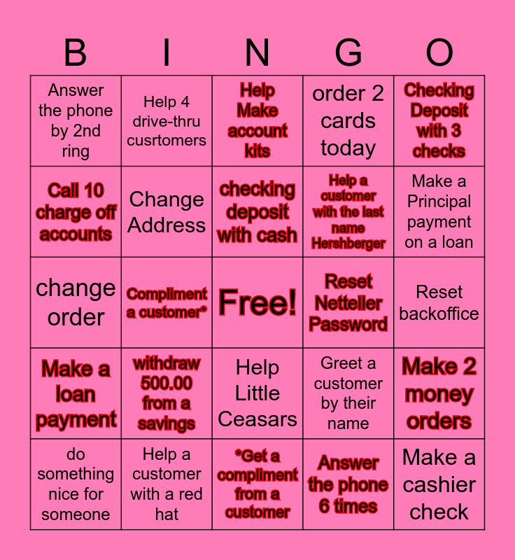 This bingo card has a free space and 24 words: withdraw 500.00 from a savings, Help a customer with a red hat, checking deposit with cash, do something nice for someone, Checking Deposit with 3 checks, Answer the phone by 2nd ring, Call 10 charge off accounts, Help 4 drive-thru cusrtomers, Reset Netteller Password, Help Little Ceasars, Help a customer with the last name Hershberger, change order, Greet a customer by their name, Make 2 money orders, Change Address, Answer the phone 6 times, Reset backoffice, Help Make account kits, Make a Principal payment on a loan, Compliment a customer*, Make a cashier check, Make a loan payment, order 2 cards today and *Get a compliment from a customer.