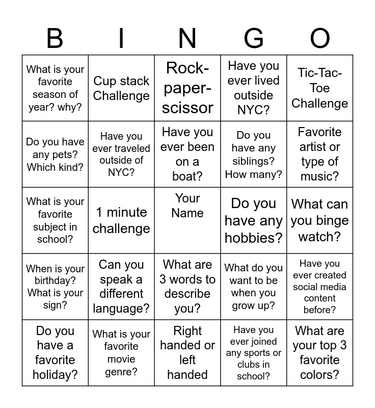This bingo card has a free space and 24 words: Can you speak a different language?, What is your favorite movie genre?, Have you ever been on a boat?, Do you have a favorite holiday?, Tic-Tac-Toe Challenge, What is your favorite season of year? why?, Do you have any pets? Which kind?, Cup stack Challenge, Do you have any hobbies?, What are 3 words to describe you?, Do you have any siblings? How many?, What is your favorite subject in school?, What do you want to be when you grow up?, Have you ever created social media content before?, Have you ever traveled outside of NYC?, Have you ever joined any sports or clubs in school?, What can you binge watch?, Rock-paper-scissor, Favorite artist or type of music?, 1 minute challenge, What are your top 3 favorite colors?, When is your birthday? What is your sign?, Have you ever lived outside NYC? and Right handed or left handed.